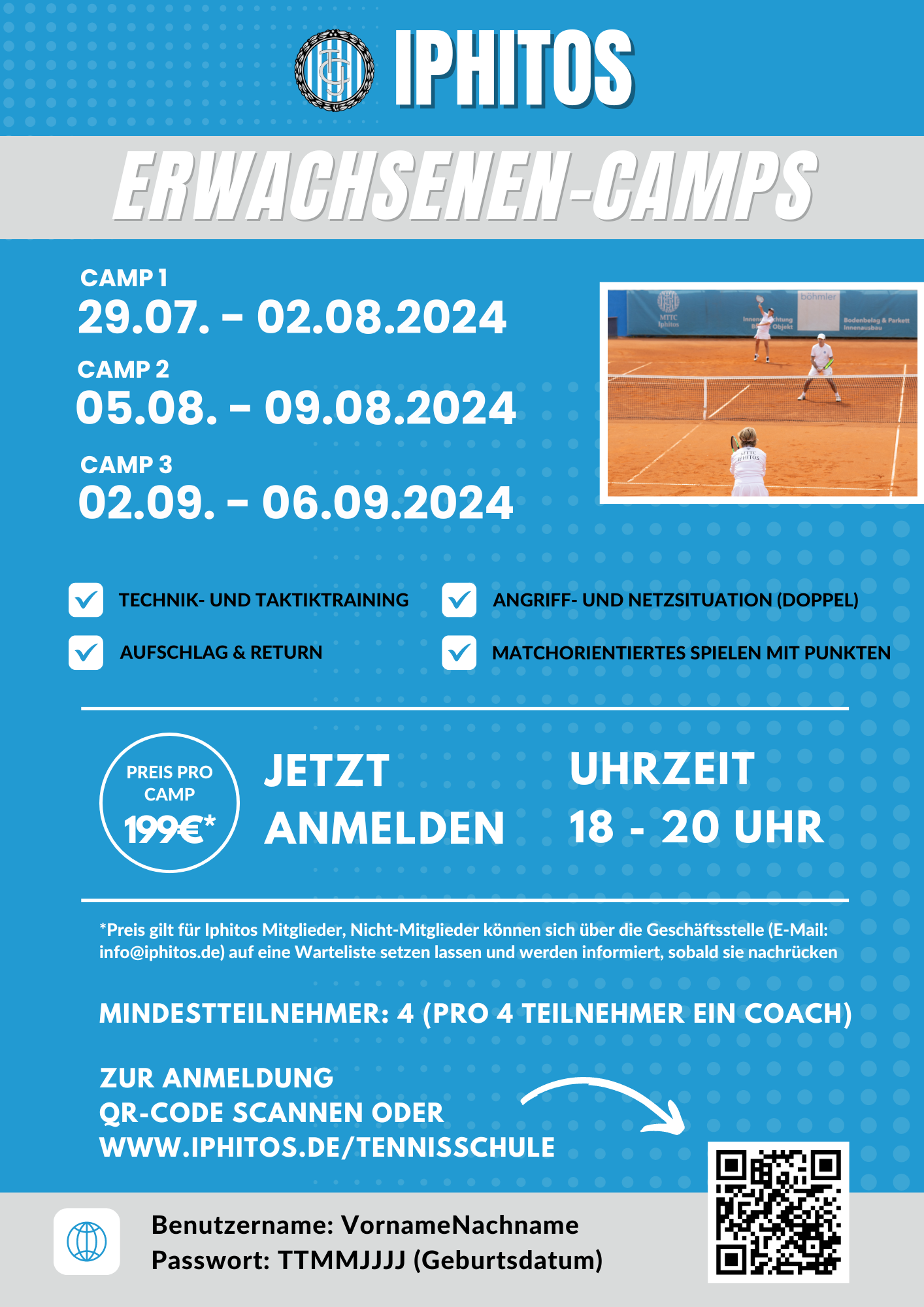 Der MTTC Iphitos e.V. bietet in den Sommerferien drei Tenniscamps für Erwachsene an. Der Schwerpunkt jedes Camps liegt auf folgenden Inhalten:
