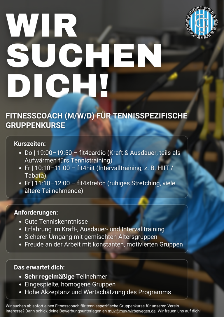 Wir suchen ab sofort einen engagierten Fitnesscoach (m/w/d) für tennisspezifische Gruppenkurse in unserem Verein.