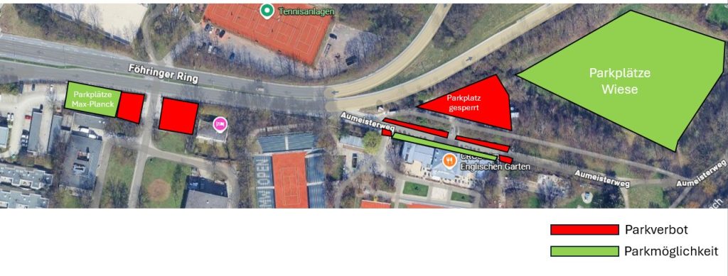 Bitte nutzen Sie die Parkplätze des Max-Planck-Instituts sowie die Grünfläche hinter dem Kies-Parkplatz (im beiliegenden Plan grün markiert). Bitte beachten Sie beim Max-Planck-Institut nur die Parkplätze auf der rechten Seite der Einfahrt zu nutzen, die nicht reserviert sind.