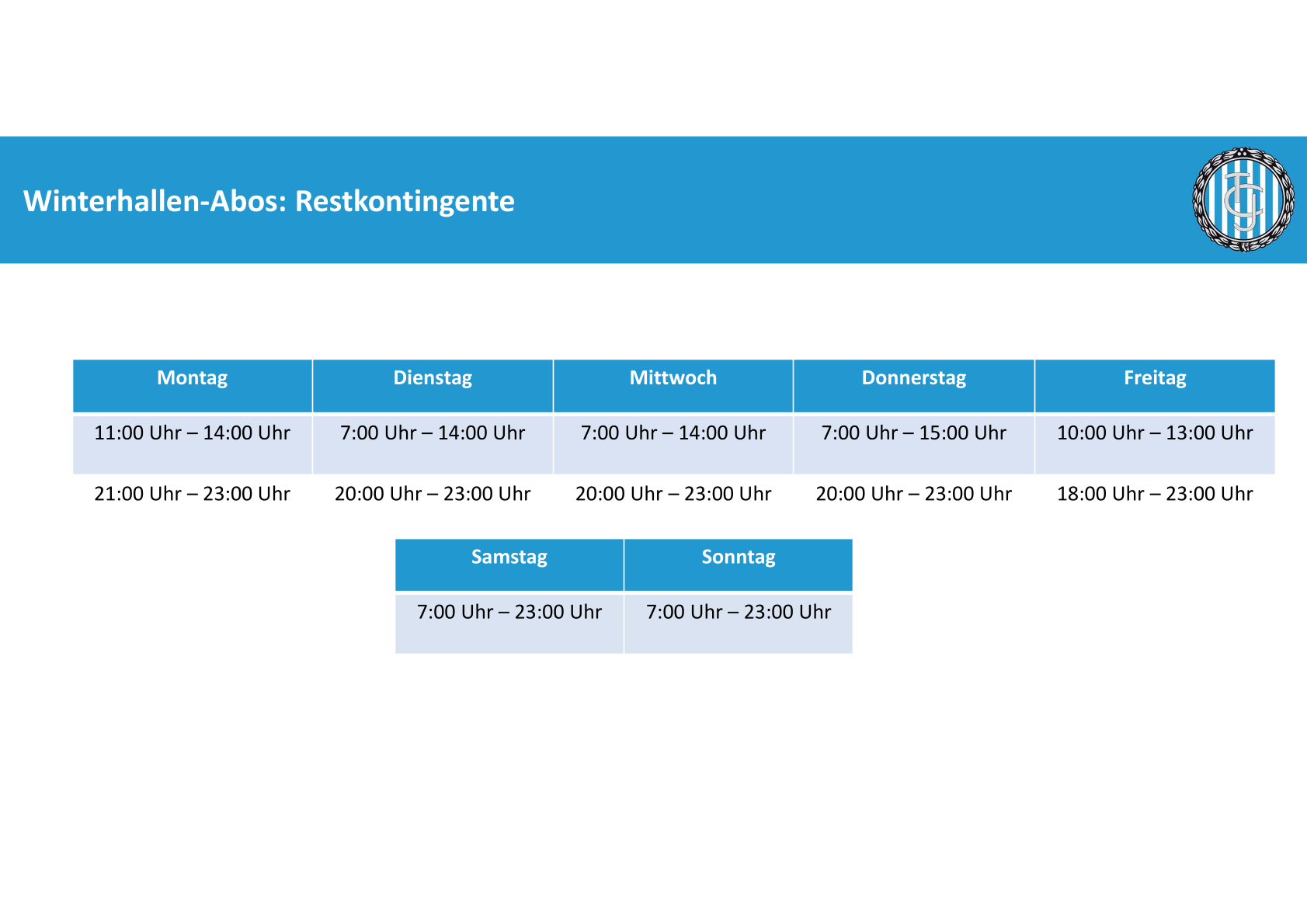 Sie haben noch kein Abo für die Winterhallensaison 2025/2026? Anbei finden Sie einen Überblick freier Zeitslots, in denen noch ein Abo erworben werden kann! Ihr Abonnement können Sie über die Geschäftsstelle via E-Mail an info@iphitos.de oder telefonisch unter 089 32 20 90 3 buchen. Sie können dann über die gesamte Wintersaison hinweg (29.09.2025 bis 15.03.2026) zu gewohnter Zeit auf gewohntem Platz spielen.